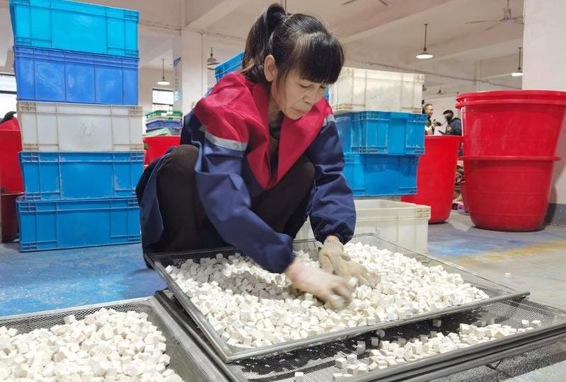 A staff member arranges cut pieces of poria cocos at a poria cocos processing factory in Jingzhou County, Huaihua, central China's Hunan Province, Oct. 22, 2025. (Xinhua/Wang Teng)