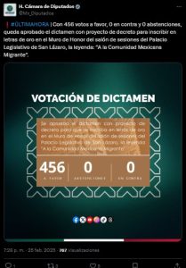 Por unanimidad de 456 votos, el Pleno de la Cámara de Diputados aprobó inscribir con letras de oro en el muro de honor del salón de sesiones la frase “A la Comunidad Mexicana Migrante”, como reconocimiento a la gran labor y esfuerzo de las personas mexicanas migrantes.