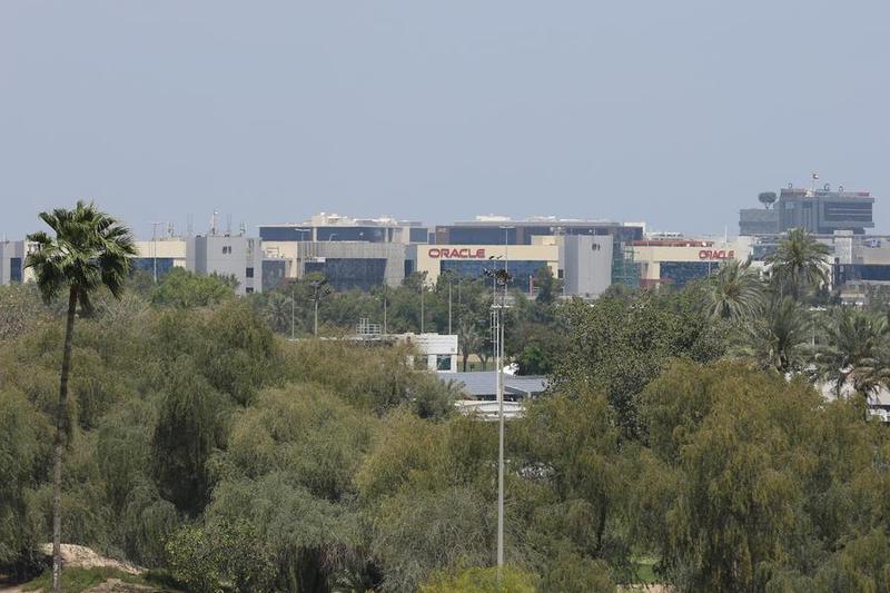 Imagen del 3 de abril de 2026 del exterior de la corporación tecnológica estadounidense Oracle, en Dubái, Emiratos Árabes Unidos. (Xinhua/Wen Xinnian)