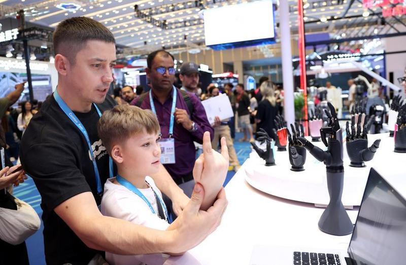 Imagen del 15 de abril de 2026 de visitantes interactuando con una mano biónica en la edición número 139 de la Feria de Importación y Exportación de China, en Guangzhou, en la provincia de Guangdong, en el sur de China. (Xinhua/Lu Hanxin)
