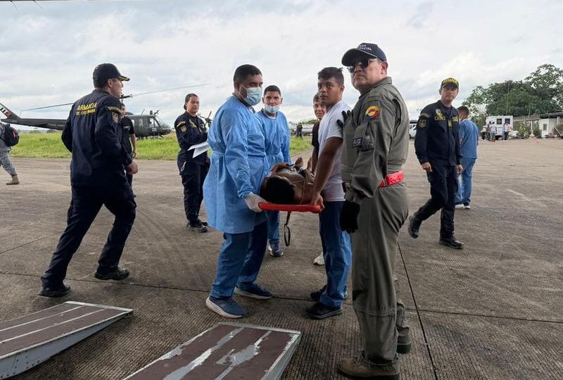 Imagen proveída por las Fuerzas Armadas de Colombia de miembros de las Fuerzas Aeroespaciales de Colombia trasladando a una persona herida hacia una aeronave, en la terminal de Puerto Leguízamo, en el departamento de Putumayo, Colombia, el 23 de marzo de 2026. (Xinhua/Fuerzas Armadas de Colombia)