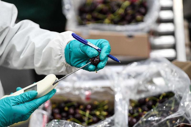 Imagen del 13 de diciembre de 2024 de un empleado revisando una cereza en la planta de Garces Fruit, en San Francisco de Mostazal, en la región de O'Higgins, Chile. (Xinhua/Jorge Villegas)