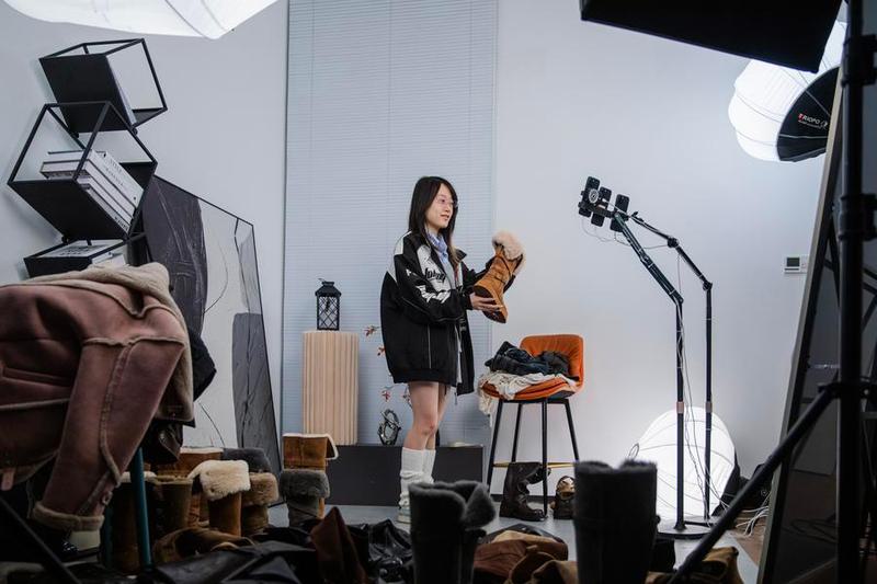 Una empleada promociona zapatos a través de una transmisión en vivo en una empresa de tecnología de redes en el distrito de Ouhai de Wenzhou, en la provincia oriental china de Zhejiang, el 10 de noviembre de 2025. (Xinhua/Liu Jili)