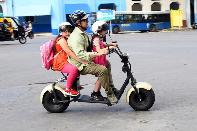 Imagen del 13 de marzo de 2026 de personas circulando a bordo de un vehículo eléctrico por una calle en medio de la escasez de combustible, en La Habana, capital de Cuba. (Xinhua/Joaquín Hernández)