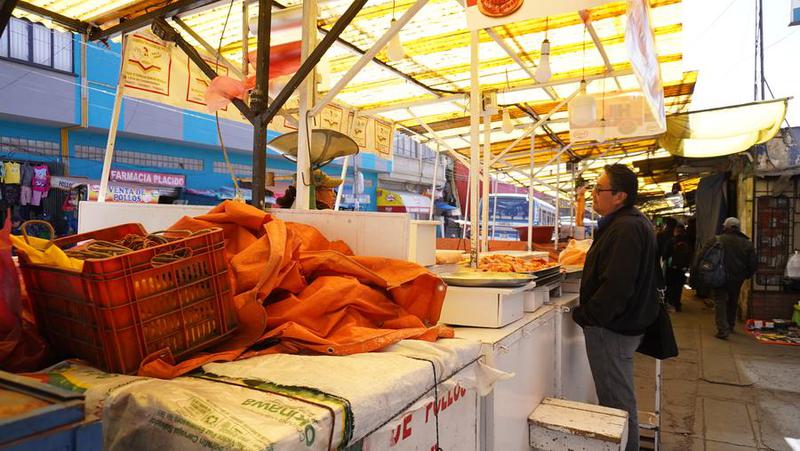 Imagen del 13 de junio de 2025 de puestos de venta de pollo semi vacíos en un mercado, en la ciudad de La Paz, Bolivia. (Xinhua/Javier Mamani)