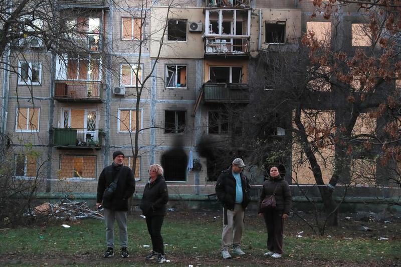 Personas permanecen frente a un edificio residencial dañado tras los ataques nocturnos con drones y misiles balísticos rusos, en Kiev, Ucrania, el 14 de noviembre de 2025. (Xinhua/Li Dongxu)