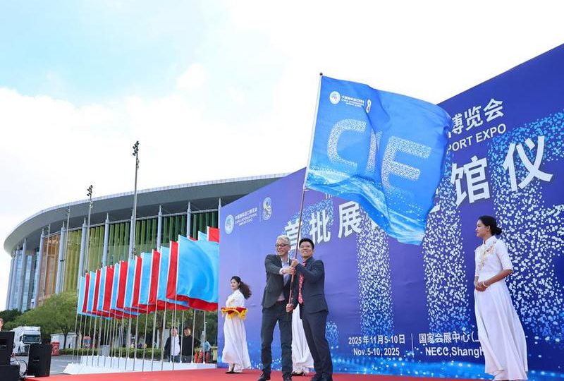 Representantes de los expositores para la próxima 8ª Exposición Internacional de Importaciones de China (CIIE, por sus siglas en inglés) ondean una bandera durante una ceremonia que marca la llegada de las piezas de exhibición al Centro Nacional de Exposiciones y Convenciones (Shanghai), la sede principal de la CIIE, en Shanghai, en el este de China, el 23 de octubre de 2025. (Xinhua/Fang Zhe)
