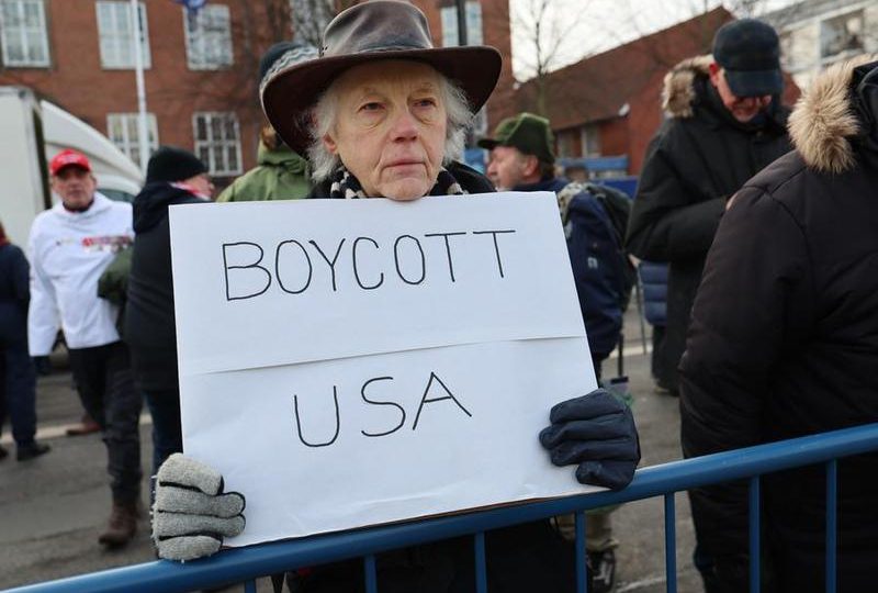 Imagen del 31 de enero de 2026 de una manifestante sosteniendo un cartel de "boicot a Estados Unidos" cerca de la embajada de Estados Unidos, en Copenhague, Dinamarca. (Xinhua/Anders Kongshaug)