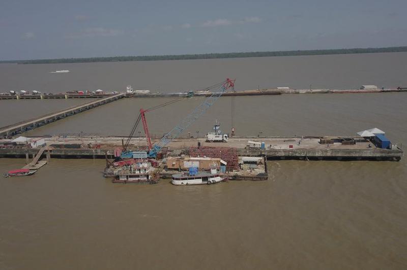 Vista aérea tomada por un dron el 27 de agosto de 2025 del sitio de construcción de un nuevo puerto para el atraque de buques que servirán como hoteles durante la Conferencia de las Partes (COP30) de la Convención Marco de las Naciones Unidas sobre Cambio Climático, en Belém, estado de Pará, Brasil. (Xinhua/Lucio Tavora)