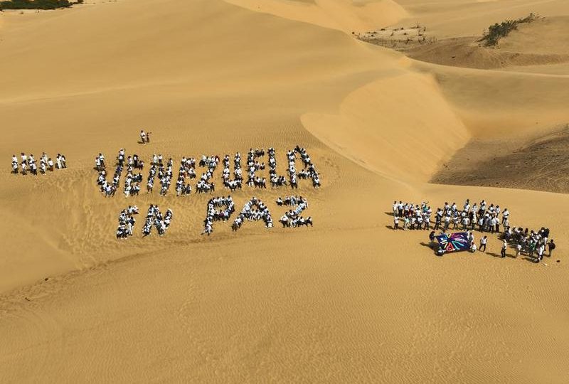 Personas realizan una pizarra humana como parte de la "Gran Peregrinación Nacional por una Venezuela sin Sanciones y en Paz", encabezada por la presidenta encargada del país, Delcy Rodríguez, en los Médanos de Coro, en el estado de Falcón, el 21 de abril de 2026. (Xinhua/Presidencia de Venezuela)