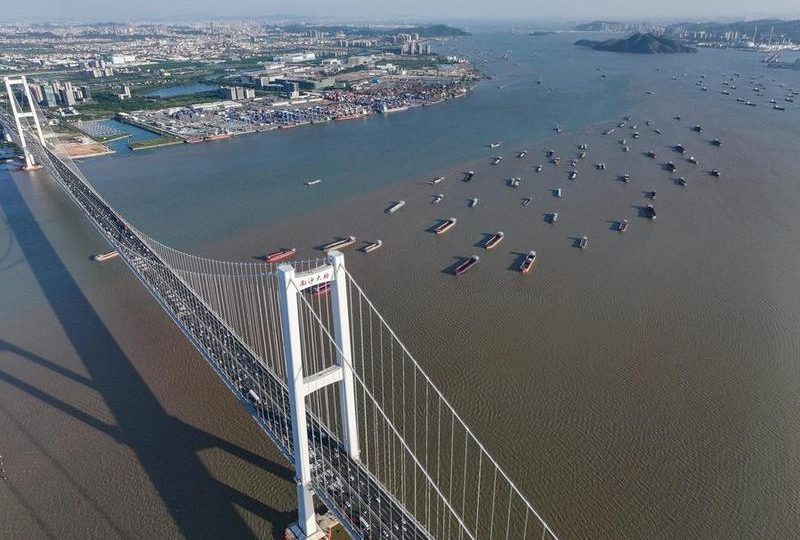 Vista aérea tomada con un dron el 2 de octubre de 2024 del puente Nansha, que conecta la ciudad de Guangzhou y la ciudad de Dongguan, y barcos a lo largo del canal de Shiziyang en el área del Estuario del Río de las Perlas, en la provincia de Guangdong, en el sur de China. (Xinhua/Liu Dawei)