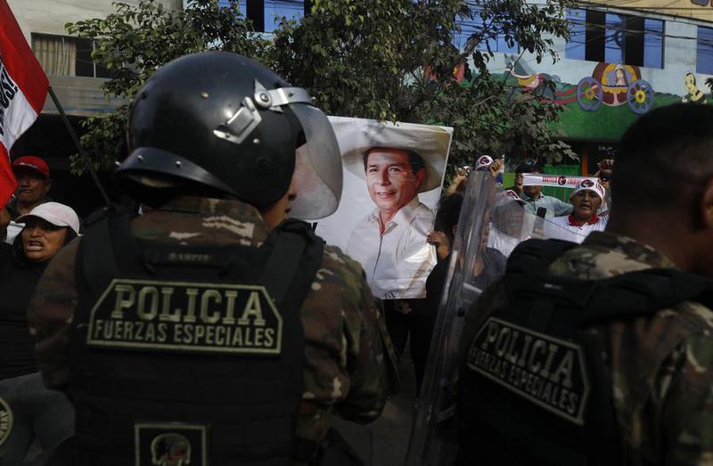 Simpatizantes del expresidente peruano, Pedro Castillo, se reúnen en el exterior del centro penitenciario de Barbadillo durante su juicio oral, en Lima, Perú, el 4 de marzo de 2025. (Xinhua/Mariana Bazo)
