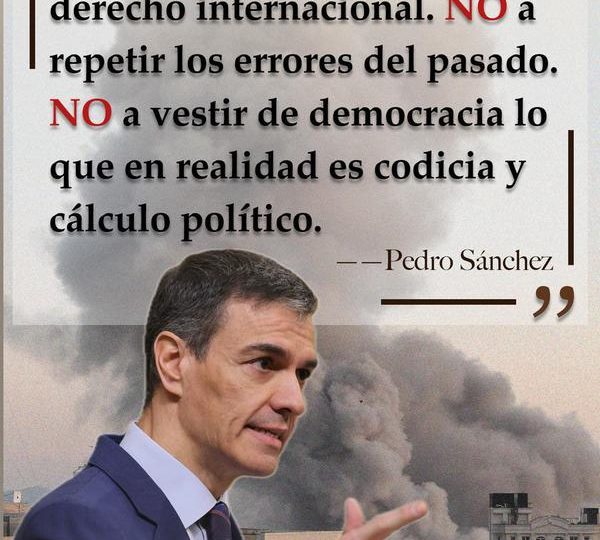 “Decimos no a la ruptura unilateral del derecho internacional, no a repetir los errores del pasado, no a vestir de democracia lo que en realidad es codicia y cálculo político. En definitiva, no a la guerra. El mismo no a la guerra de hace 23 años”, defendió el 25 de marzo el presidente del Gobierno español, Pedro Sánchez, al referirse al conflicto en Medio Oriente durante su comparecencia ante el Congreso de los Diputados de España.