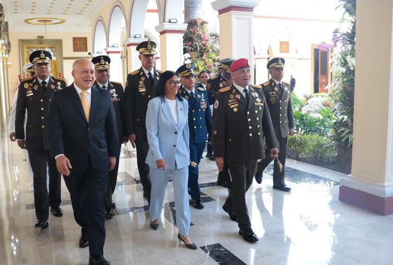 Imagen proveída por la Presidencia de Venezuela del 19 de marzo de 2026 de la presidenta encargada venezolana, Delcy Rodríguez (c-frente), caminando junto al ministro de Interior, Justicia y Paz venezolano, Diosdado Cabello (i-frente), el ministro de Defensa, Gustavo González López (d-frente), e integrantes del nuevo Alto Mando Militar de la Fuerza Armada Nacional Bolivariana, en el Palacio de Miraflores, en Caracas, Venezuela. (Xinhua/Presidencia de Venezuela)