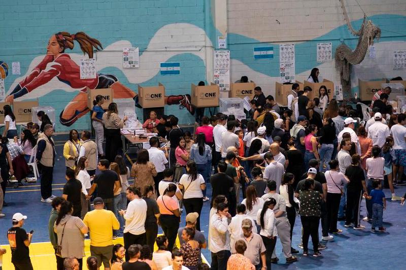 Personas se forman mientras esperan para emitir su voto en un colegio electoral durante las elecciones presidenciales, en Tegucigalpa, capital de Honduras, el 30 de noviembre de 2025. (Xinhua/David de la Paz)