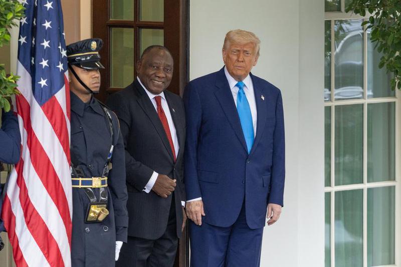 Imagen del 21 de mayo de 2025 del presidente estadounidense, Donald Trump, recibiendo al visitante presidente sudafricano, Cyril Ramaphosa (c), en la Casa Blanca, en Washington, D. C., Estados Unidos. (Xinhua/Hu Yousong)