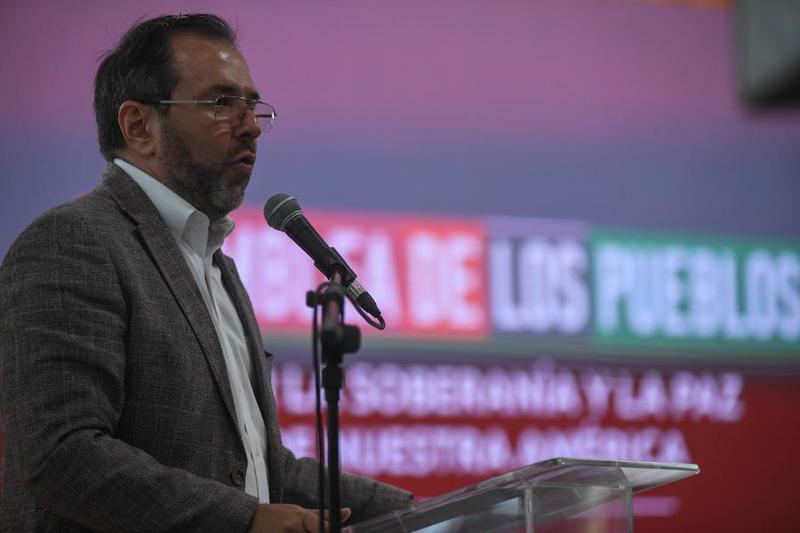 El ministro de Relaciones Exteriores venezolano, Yván Gil, habla durante la apertura del evento denominado Asamblea de los Pueblos por la Paz y la Soberanía de Nuestra América, en Caracas, capital de Venezuela, el 9 de diciembre de 2025. (Xinhua/Marcos Salgado)