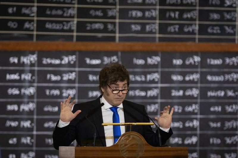 (Imagen del 10 de julio de 2025 del presidente argentino, Javier Milei, reaccionando durante el acto por el 171º aniversario de la Bolsa de Comercio de Buenos Aires, en la ciudad de Buenos Aires, capital de Argentina. (Xinhua/Martín Zabala)
