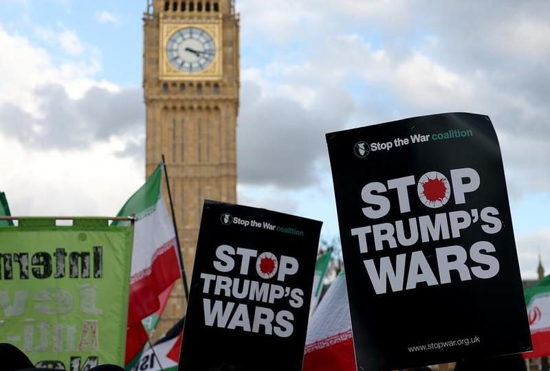 Personas sostienen carteles durante una protesta en contra de los ataques de Estados Unidos e Israel contra Irán, en la Plaza del Parlamento, en el centro de la capital británica, Londres, el 28 de febrero de 2026. (Xinhua/Li Ying)